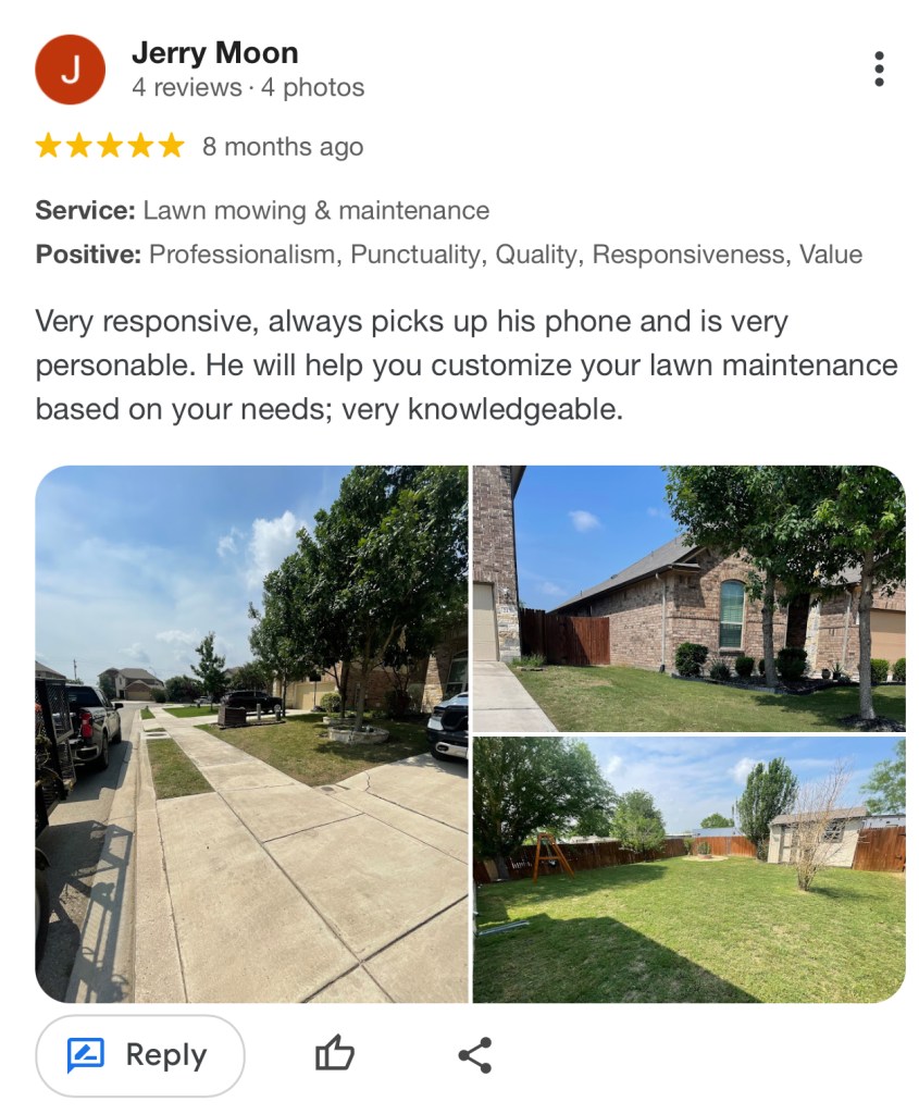 - Text Message reminder that you are scheduled for lawn service the weekend of or days before your scheduled appointment so you know when to expect our services.